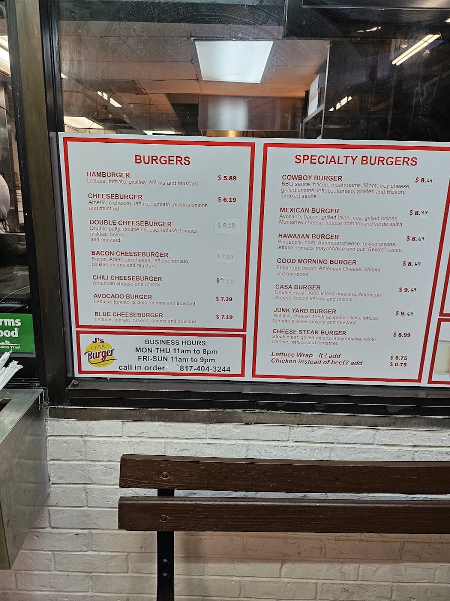 Welcome to J's Casa Burger, a delightful eatery located at 5181 River Oaks Blvd, River Oaks, TX. This charming spot specializes in mouthwatering burgers, each crafted with fresh ingredients and bold flavors. The menu features a variety of options, such as the classic Bacon Cheeseburger, rich with bacon and American cheese, and the zesty Mexican Burger, loaded with grilled jalapeños and avocado.